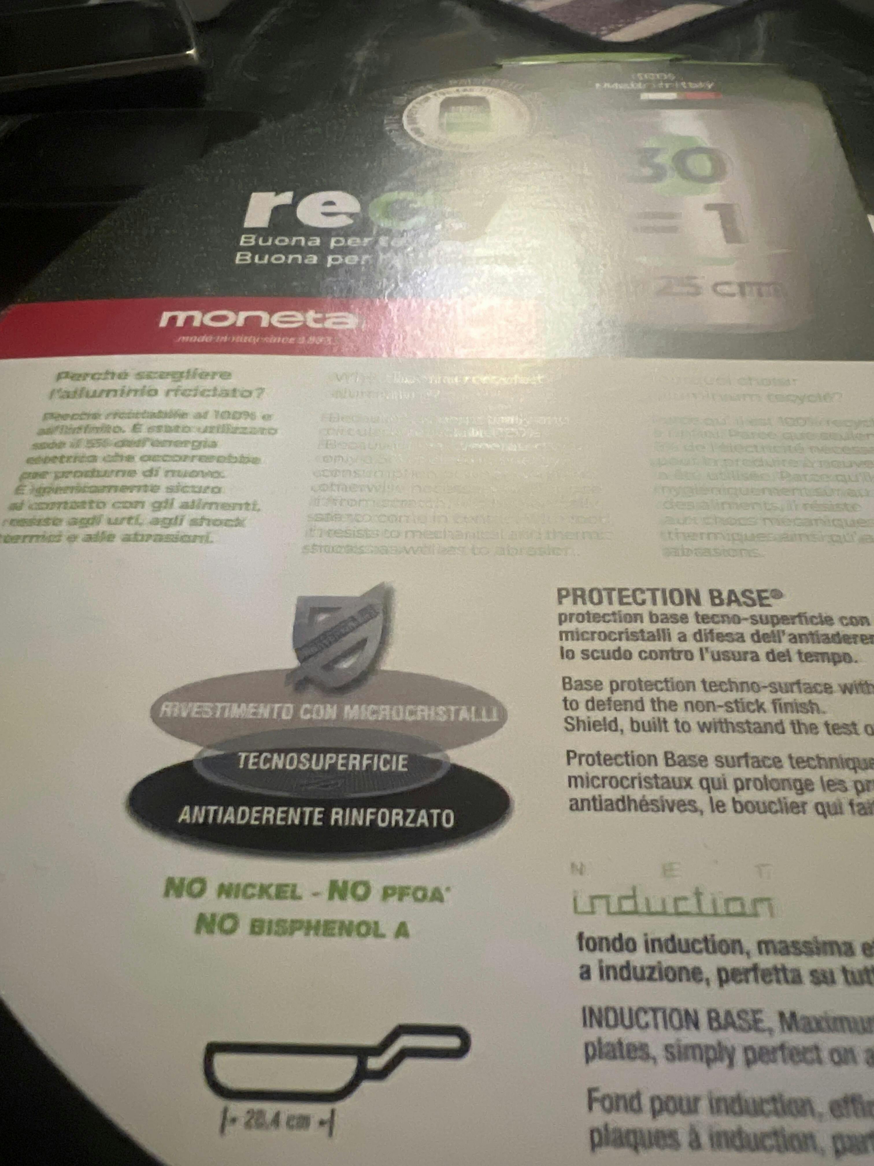 Rivestimento Protection Base: uno scudo per la tua pentola; è il sistema di applicazione brevettato Moneta che garantisce doppia durata e resistenza dell’antiaderenza.Durante la verniciatura viene aggiunta una tecno-superficie intermedia sulla base antiaderente e un ulteriore strato protettivo con micro-cristalli in grado di rinforzare e sigillare l’intera superficie. No PFOA, No Nichel, No Bisfenolo A.